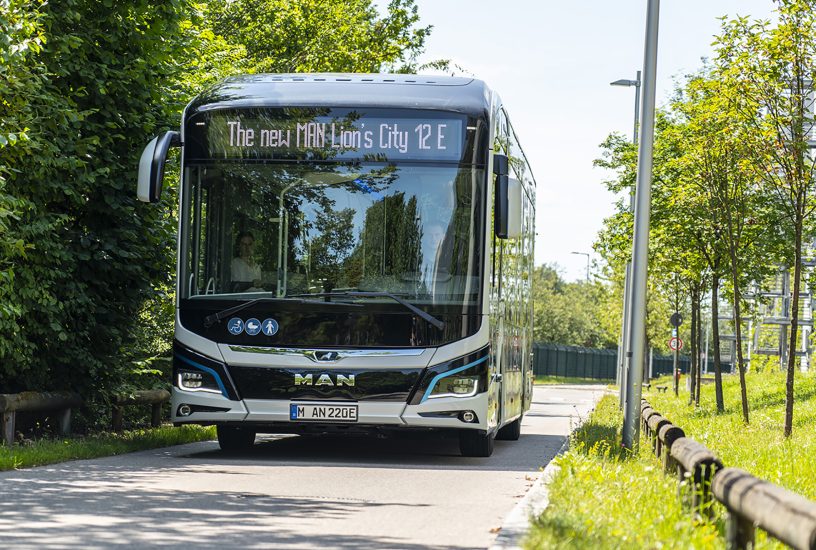Il MAN Lion’s City E, nella versione da 12 metri, può ospitare fino a 88 passeggeri. Il motore centrale si trova sull’asse posteriore. La trasmissione elettrica eroga da 160 a 240 kW. Il mezzo riceve l’energia dalle batterie modulari da 480 kWh.