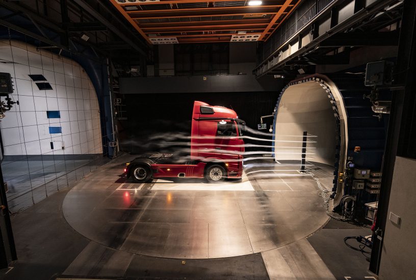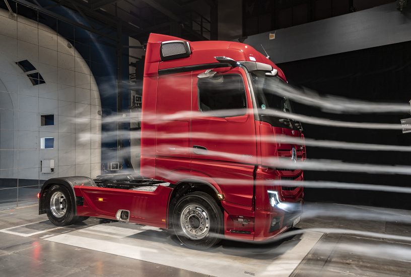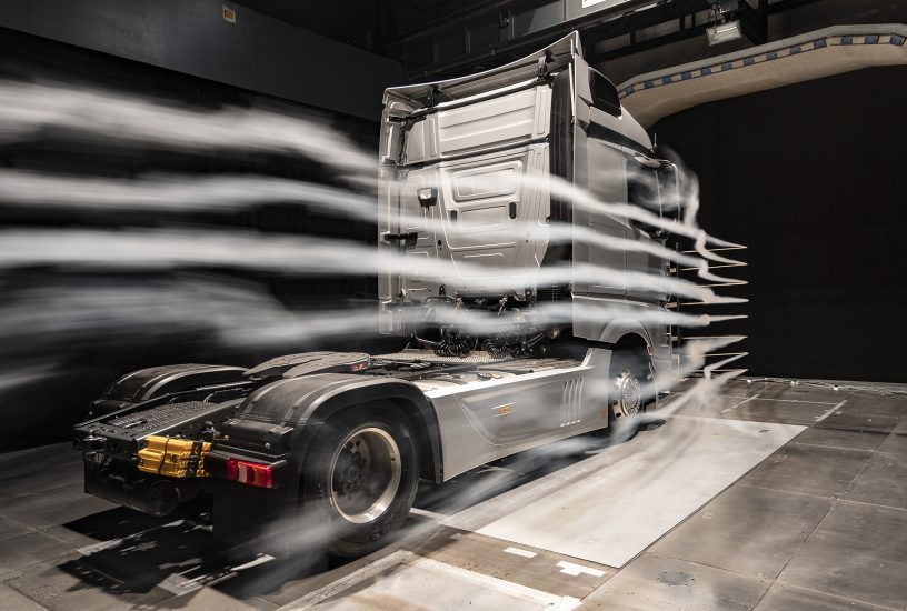 Queste migliorie sono state possibili grazie al lavoro nella galleria del vento della Daimler AG di Unterturkheim. Qui gli ingegneri hanno effettuato numerosi test sulle MirrorCam per osservare i flussi dell’aria sul truck e per ottimizzare il coefficiente Cx. Per esempio, è stata perfezionata la forma aerodinamica dei 2 bracci delle telecamere e il loro posizionamento su entrambi i lati della cabina di guida. Infatti, rispetto agli specchi retrovisori tradizionali, sul nuovo Mercedes-Benz Actros i bracci sono stati fissati sul telaio del tetto.