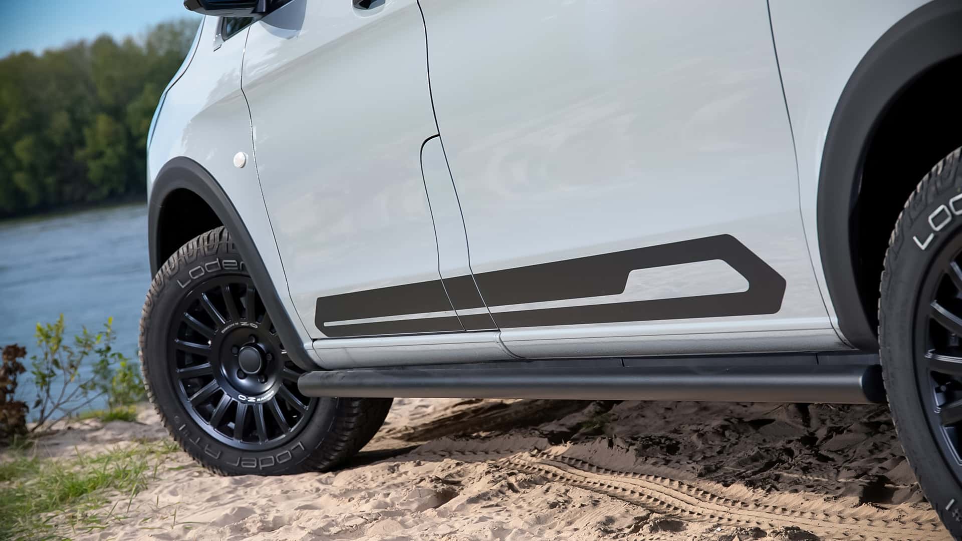 Le sospensioni rialzate sollevano l’anteriore di 35 mm e il posteriore di 40 mm, grazie ai nuovi ammortizzatori e alle molle appositamente realizzate. I cerchi personalizzati da 17 pollici, uniti agli pneumatici All-Terrain General Grabber 235/55, aumentano la luce da terra di 18 mm e sono  disponibili in bronzo opaco o nero.